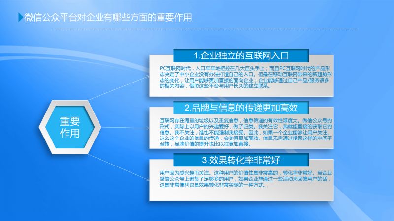【微平台】你不知道的微信公众平台正确的打开方式对于企业来讲,可以没有网站,没有微博,但不能没有微信公众号。目前有1500万微信公众号,以最保守数据10%来估算,其中的企业公众号至少有150万家。作为企业的官网自媒体,微信公众平台因其黏性传播模式、点对点的信息推送、个性化的信息接收等特点,已成为传播的“标配”。 从传统媒体到新媒体转型,自媒体作为阶段性产物,企业自媒体打造,早已成为营销标配,然而,企业自媒体运营是一个系统性很强又复杂的工作,不是写好爆文,能涨粉就行,食之不得其法,弃之落后于时代,微信公众号已成为越来越多企业的“标配性枷锁”。 微信已经走到了这五个年头,野蛮成长期已经成为过去式,精细化运营才是主流。再小的个体,也有自己的品牌。这是微信的宣传语,着实让无数企业为之意动。尤其是新兴企业,这么好的一个运营渠道,求之不得。 那么企业做不做微信公众平台,答案无疑是肯定的——微信公众号作为移动互联网时代的营销推广手段,无论什么时候做都来得及,而且势在必行,一定要做。微信在全国有七亿用户,这是一个十分庞大的潜在用户群体。一些大型的上市公司都在紧锣密鼓收购微信大号,为什么?说明粉丝就是利润的创造源泉,说明微信公众号的威力无穷。